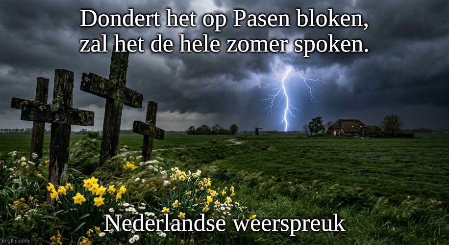 Afbeelding: Peter van Geest AI. Betekenis 📖 : De weerspreuk “Dondert het op Pasen bloken, zal het de hele zomer spoken” is een voorbeeld van traditionele volkswijsheid, ook wel bekend als een weerregel. De betekenis is vrij direct:🌩️ De Voorspelling: Als het onweert (dondert) tijdens de paasdagen… ☀️➡️⛈️ Het Gevolg: …dan kun je een onstuimige zomer verwachten. In deze context betekent “spoken” dat de zomer geteisterd zal worden door slecht weer, met name veel onweersbuien, harde wind en algemene instabiliteit. Het is dus geen positieve weersvoorspelling! De term ‘bloken’: Dit is een ouderwetse of dialectische term die “in grote, zware onweerskoppen” of “hevig” kan betekenen. Het versterkt het idee van een zware, indrukwekkende onweersbui op paaszondag of paasmaandag. ⏳ Oorsprong: De oorsprong van deze specifieke spreuk is moeilijk tot één exact moment of één specifieke persoon te herleiden. Dit is typisch voor weerspreuken. Dit is wat we weten: 👪 Volksmond: Weerspreuken ontstonden in de tijd dat mensen voor hun dagelijks leven en overleving (denk aan de landbouw) sterk afhankelijk waren van het weer. Omdat ze geen moderne meteo-apparatuur hadden, observeerden ze patronen in de natuur en verbonden ze bepaalde gebeurtenissen (zoals onweer op een feestdag) aan de gevolgen voor het komende seizoen. Deze observaties werden generatie op generatie doorgegeven en gerijmd om ze makkelijker te onthouden. 🗺️ Regionaal:Deze spreuk is vooral bekend in Nederland en Vlaanderen. Vergelijkbare spreuken, maar dan met andere feestdagen of weersverschijnselen, komen in heel Europa voor. 🕊️ Religieuze Koppeling: Het is gebruikelijk dat belangrijke weersvoorspellingen werden gekoppeld aan christelijke feestdagen zoals Pasen, Kerstmis, of de dagen van specifieke heiligen (de zogenaamde ‘IJsheiligen’). Dit gaf de spreuk meer gewicht en zorgde ervoor dat hij op een vaste datum elk jaar herinnerd werd. Pasen valt elk jaar op een andere datum (tussen eind maart en eind april). ✍️ Auteur: Er is geen specifieke auteur bekend van deze spreuk. Het is een product van de orale traditie en collectieve observatie door boeren, zeelieden en buitenmensen door de eeuwen heen. Omdat het rijmde en een duidelijke voorspelling gaf, bleef het hangen in de volkstaal. Niemand heeft dit opgeschreven en er zijn naam onder gezet; het is simpelweg onderdeel van ons cultureel erfgoed.