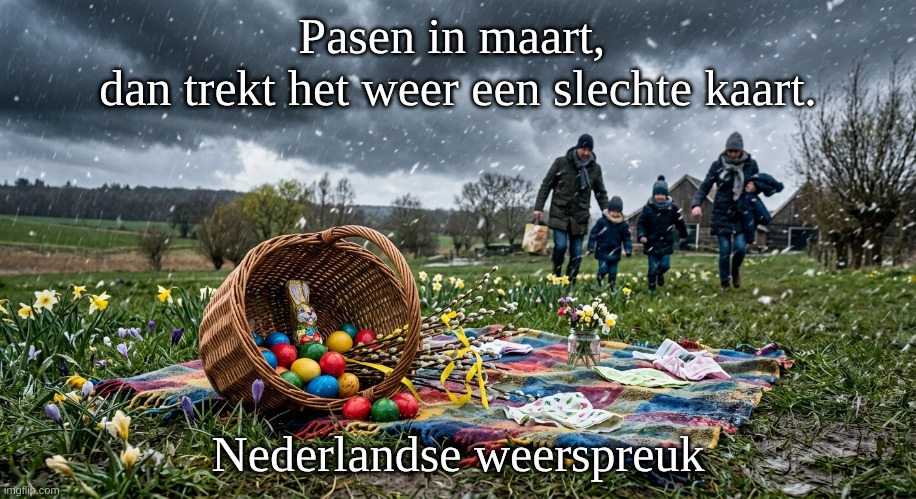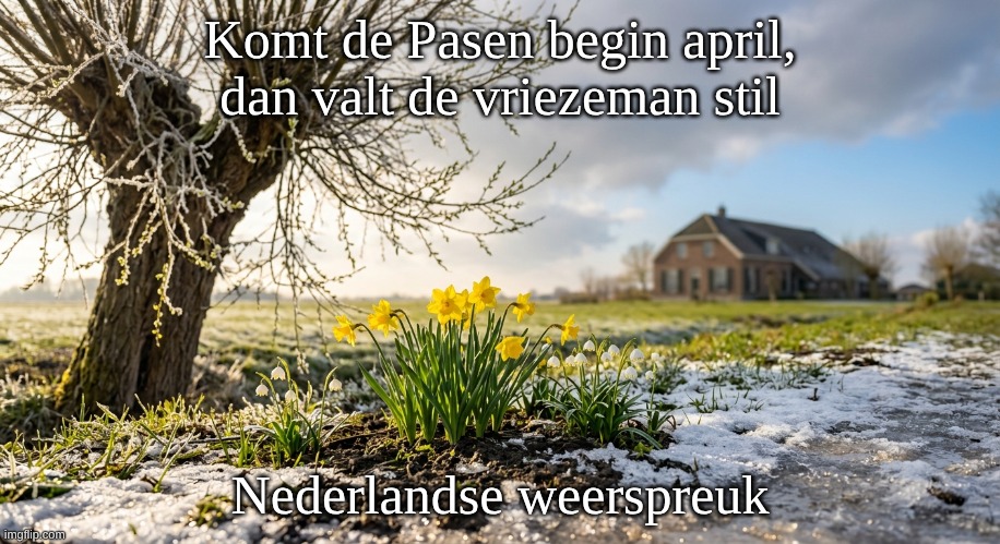 Afbeelding: Peter van Geest AI. Betekenis 🧐: De spreuk “Komt de Pasen begin april, dan valt de vriezeman stil” is een oude volkswijsheid over het weer. De kernboodschap is simpel: Als Pasen vroeg in de maand april valt, wordt voorspeld dat de kans op nachtvorst vanaf dat moment aanzienlijk kleiner wordt. De “vriezeman” ❄️ is een personificatie van de vorst. Als hij “stilvalt”, betekent dit dat het stopt met vriezen. Het is een optimistische spreuk die het einde van de winterse kou en het definitieve begin van de lente 🌷 aankondigt. 💡 Kanttekening: Zoals bij veel weerspreuken is dit geen wetenschappelijk bewezen feit, maar eerder een observatie gebaseerd op jarenlange volkservaring. Het weer kan natuurlijk altijd anders uitpakken! 🌱 De oorsprong van deze spreuk ligt in de volksweerkunde. Boerenwijsheid: Vroeger waren boeren 👨🌾 volledig afhankelijk van het weer voor hun oogst. Ze observeerden de natuur en het klimaat nauwgezet en legden patronen vast in rijmpjes en spreuken. Zo konden ze deze makkelijker onthouden en doorgeven. Mondelinge Overlevering: Deze rijmpjes werden generaties lang mondeling doorgegeven. Omdat ze op rijm waren (“april” en “stil”), waren ze makkelijk te onthouden voor mensen die vaak niet konden lezen of schrijven. Religieuze Kalender: Omdat Pasen een variabele feestdag is die de overgang van winter naar lente markeert, was het een belangrijk ijkpunt in de boerenkalender om te bepalen wanneer het veilig was om te zaaien zonder risico op vorstschade. ✍️ Auteur: Er is geen specifieke auteur bekend voor deze spreuk. Collectief Bezit: Dit soort weerspreuken zijn ontstaan uit de collectieve ervaring en observaties van plattelandsgemeenschappen over eeuwen heen. Het is een product van de volkscultuur, niet van één individuele schrijver of dichter.